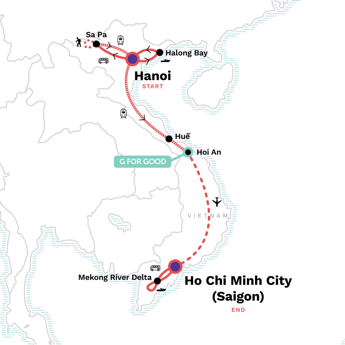Ta Van Village cultural visit, 2-day Sa Pa trekking, Bamboo Paper Making, Sail on a junk boat through Halong Bay, Explore romantic Hoi An, People-watch in hectic Ho Chi Minh City, Experience local living in the Mekong River Delta, Visit floating markets.